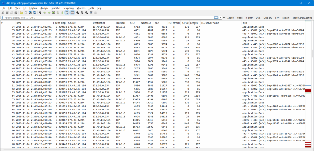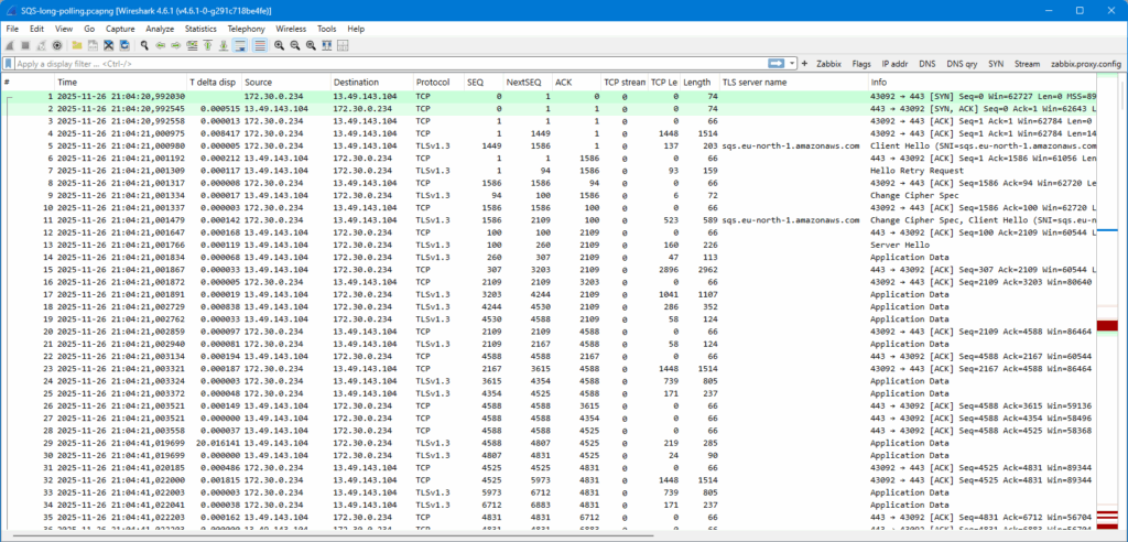 At 21:04:20 the SQS connection was initiated. The first 28 packets were exchanged right away, probably negotiating some important stuff. Note that the last packets 26-28 in that batch are just empty ACKs from the SQS queue endpoint, so the client was the last one sending any actual data.