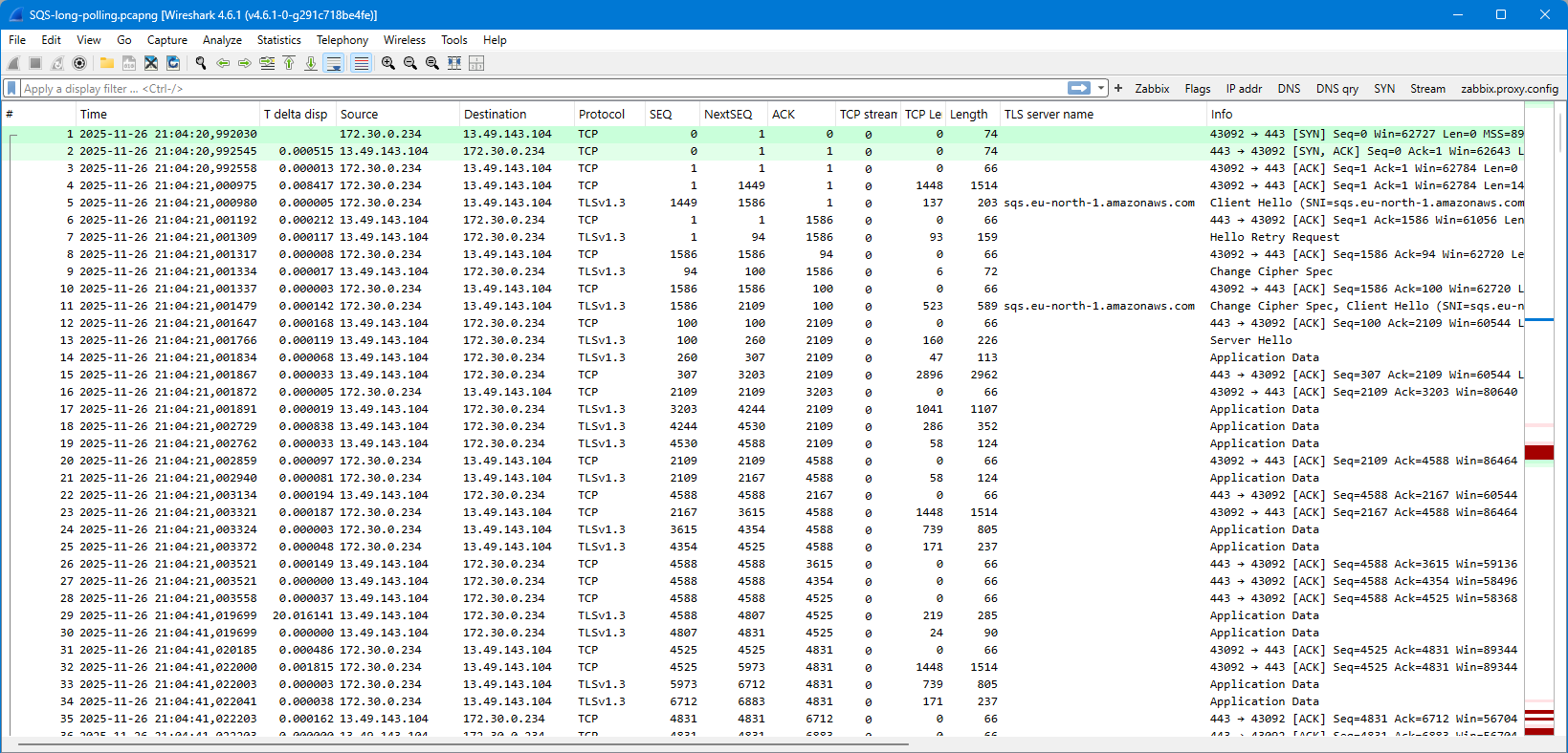 At 21:04:20 the SQS connection was initiated. The first 28 packets were exchanged right away, probably negotiating some important stuff. Note that the last packets 26-28 in that batch are just empty ACKs from the SQS queue endpoint, so the client was the last one sending any actual data.